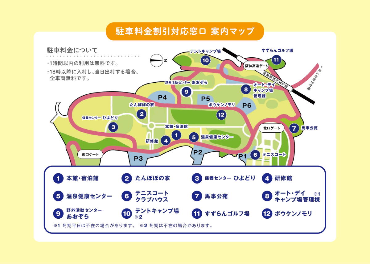 18歳未満のお子様が同乗されている車両(大型除く)は、しあわせの村駐車料金が無料になります。